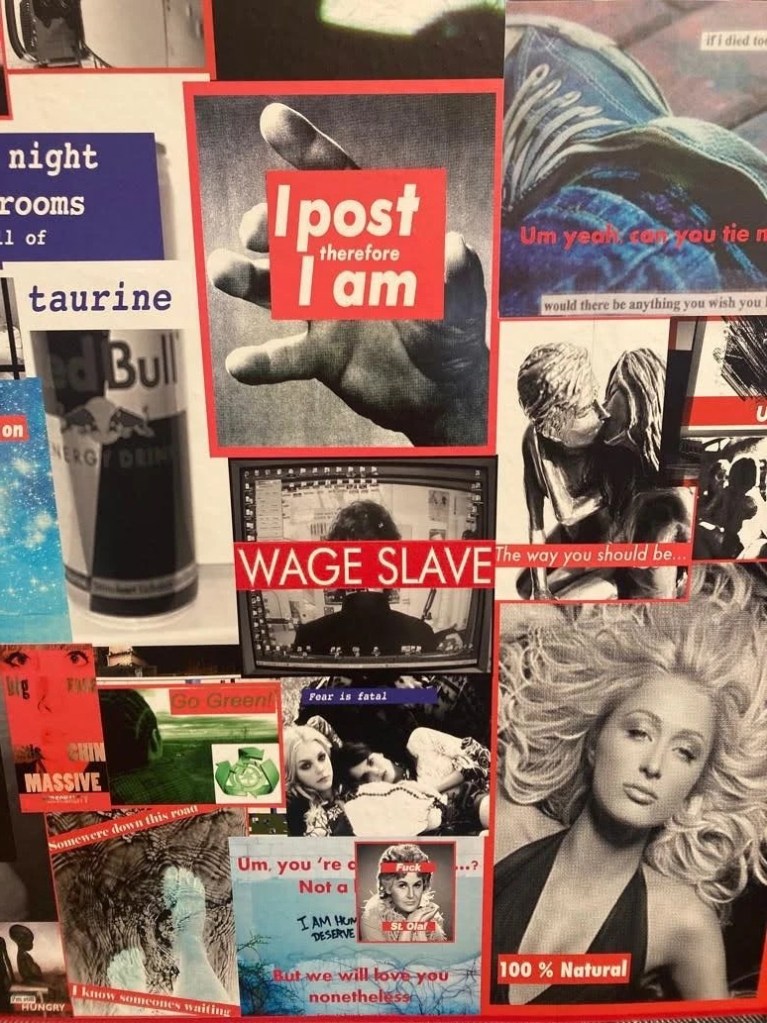 Kruger’s 2024 exhibition at the Serpentine, ‘Thinking of You, I Mean Me, I Mean You’, is an immersion into this world of dizzying discombobulation, of brazen information overload. In the South Gallery, Kruger presents works in her iconic photo-collage style. The walls are pasted with six large-format posters that collate parodic appropriations of her works mined from the corners of Tumblr, Instagram and Google Images. By turns pithy, ironic, and searingly truthful, this repository includes a sexy Paris Hilton still emblazoned with ‘100% natural’, a witty rejoinder to Descartes for the social media age (‘I post, therefore I am’), and a Hollywood pin-up tagged with ‘Makeup Makes The Heart Grow Fonder’. These displays powerfully convey the circular economy of imagery, the ways visual messages are continually ingested, appropriated and repurposed, for ends that purport to be trivial but which are, in fact, deeply political. Thus, divesting art of one of its central myths, Kruger suggests that the hand that constructs – or, more frequently, screenshots and edits – is always social.