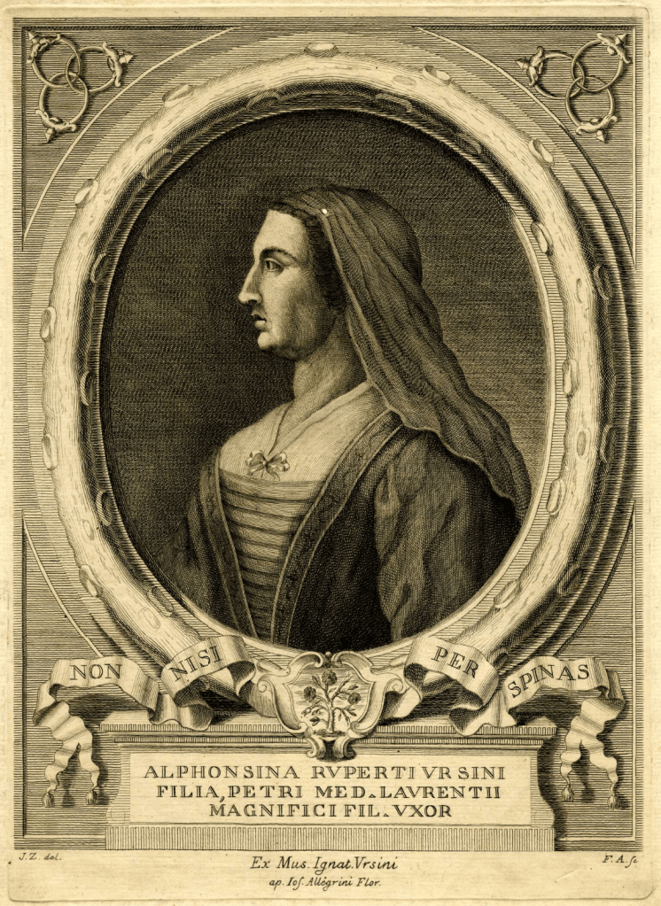 Born in 1472, Italian noblewoman Alfonsina Orsini (1472-1520) was raised in the royal court of Naples, a vibrant cultural centre during the Renaissance. Her father, Count Roberto Orsini, was a close ally of Ferrante, King of Naples. Following her father’s premature death, the young Alfonsina was brought up by her wealthy mother and her powerful uncle, who maintained close links with Ferrante. The sixteen years that this singularissima donna—or ‘most singular woman’ as one sixteenth-century biographer named her—spent in Naples proved foundational to her subsequent activities as a patron; first as a young spouse in Florence, and later as a widow in Rome, Florence, and the Tuscan countryside.