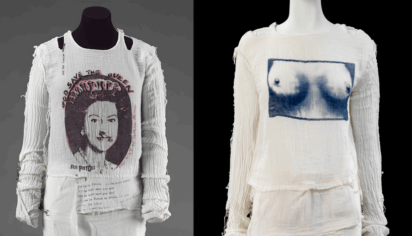 The designs from the shop’s early years were suitably brazen. One of the T-shirts featured a graphic print of a woman’s breasts, cheekily positioned to draw the eye to the wearer’s own chest. Another T-shirt was adorned by a graphic print of Queen Elizabeth II, her lips safety-pinned together, above the words ‘God Save The Queen’, a reference to both the national anthem and the title of a Sex Pistols song (the print was also ironically framed by the Sex Pistols lyric ‘she ain’t no human being’). These designs are unequivocally punk; they speak in the voice of common people and make a statement that attacks the establishment.