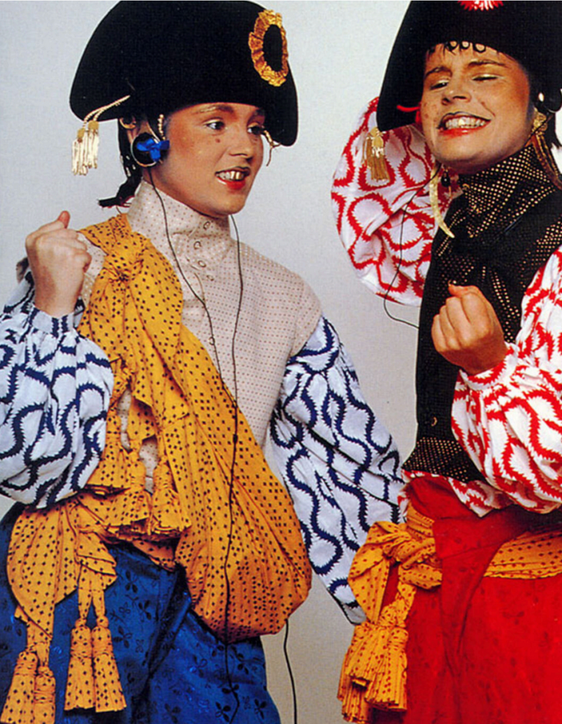 Some of her punk motifs are retained in Pirates: the clothes appear mismatched; the creasing and rumpling of the fabric is emphasised; the models don slouchy boots and layer baggy clothes. These imperfectly shaped garments pushed back against the clean lines that dominated 1980s fashion—namely in lycra fitness wear, shoulder pads, and bodycon dresses.