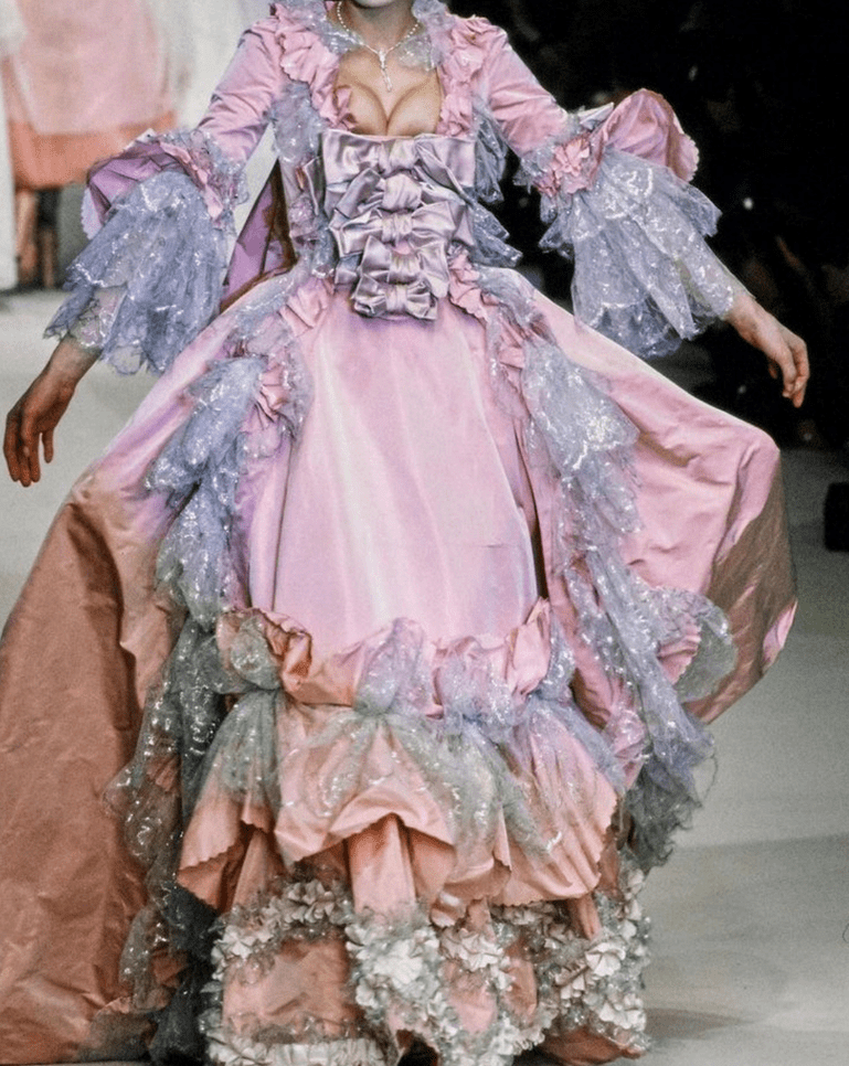 The most outrageous example of 18th-century opulence is arguably the ‘Madame Pompadour’ gown from the 1995-6 Vive La Cocotte collection—a dress so intensely aristocratic it would hardly feel out of place on a headless body in Revolutionary France. The gown is made from pale pink and shimmering blue fabric, ruched and ruffled into a tight bodice with a ballooning skirt and tight sleeves that burst forth at the ends, creating a waterfall of fabric down the arms. The five purple bows descending the bodice are so plump that they fight for space in the cinched waist. It is a stunning dress, plucked straight from the dreams of a girl who has just read Cinderella, and exudes naivety—or perhaps wilful ignorance—to the exploitation of the workers and slaves who fed the wealth of the 18th-century aristocrats and made such sumptuous attire possible.
