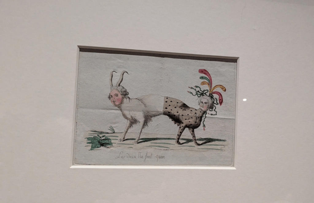 Divisive seems the most appropriate way to describe this cult of personality. The image of Madame Déficit, dressed in extravagant gowns of crepe-de-chine at a time of high unemployment, food shortages and ninety-eight percent poverty, has been symbolic of class protectionism and royal avarice. In Marie, we can find everything ugly and oppressive about the ancien régime. As this new exhibition shows, a wave of hostile satire, infused with misogyny, was hurled toward her in the 1780s. Commentators seemed insistent to degrade her political credibility through assertions of her sexual lasciviousness, economic irresponsibility and bad behaviour. One etching shows her as a monstrous harpy tearing apart the Declaration of the Rights of Man; another imagines her as the new Medusa with snakes in her hair.