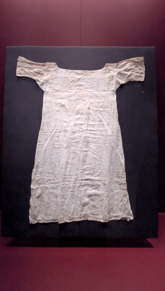 She was a victim, too, in lacking much political power in the late years of her reign—something most acutely understood in the room dedicated to Marie’s execution. Here, the music stops and her deathbed relics sit in blood-red lighting. The reported guillotine blade used for her execution, a Madame Tussauds death-mask, and a medallion containing a lock of her dark blonde hair, intertwined with her son Louis-Charles’, are some of the items on display here. The only preserved item of clothing actually worn by Antoinette throughout the entire exhibition is her thin, plain white chemise, mounted on the wall using specially-designed magnets to make it appear like a ghostly apparition.
