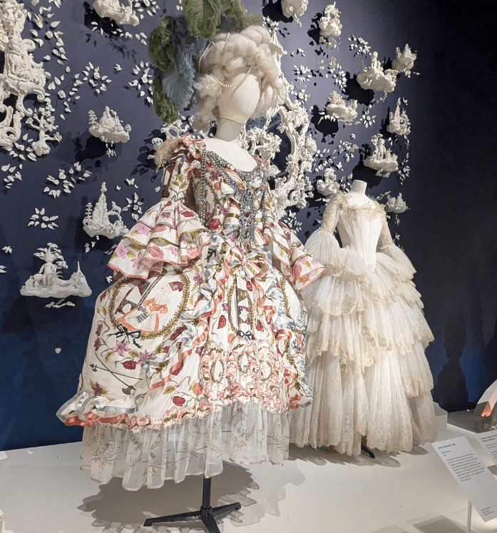 It is a wasted opportunity, then, to swiftly end the exhibition with a glittery return to a more palatable interpretation of Marie in line with the ‘style icon’ image which flattens her legacy. An opulent room filled with dresses, like John Galliano’s 2000-2001 ‘Angie’ gown from the Fetish collection and Jeremy Scott’s ‘Let them eat cake’ gown from Moschino’s 2020-21 collection, leaves a sour taste in one’s mouth by using history to justify the profit-driven, unsustainable fashion production of the present. It doesn’t show Marie as a complex and politically-fraught figure in the way the exhibition claims, in its opening, that it will do. By the end, we seem to have backtracked on any empathy extended to the woman behind such an elusive and multifaceted image. She is, instead, reduced to a caricature, celebrating commercialised royalty as if it were her most important historical contribution.