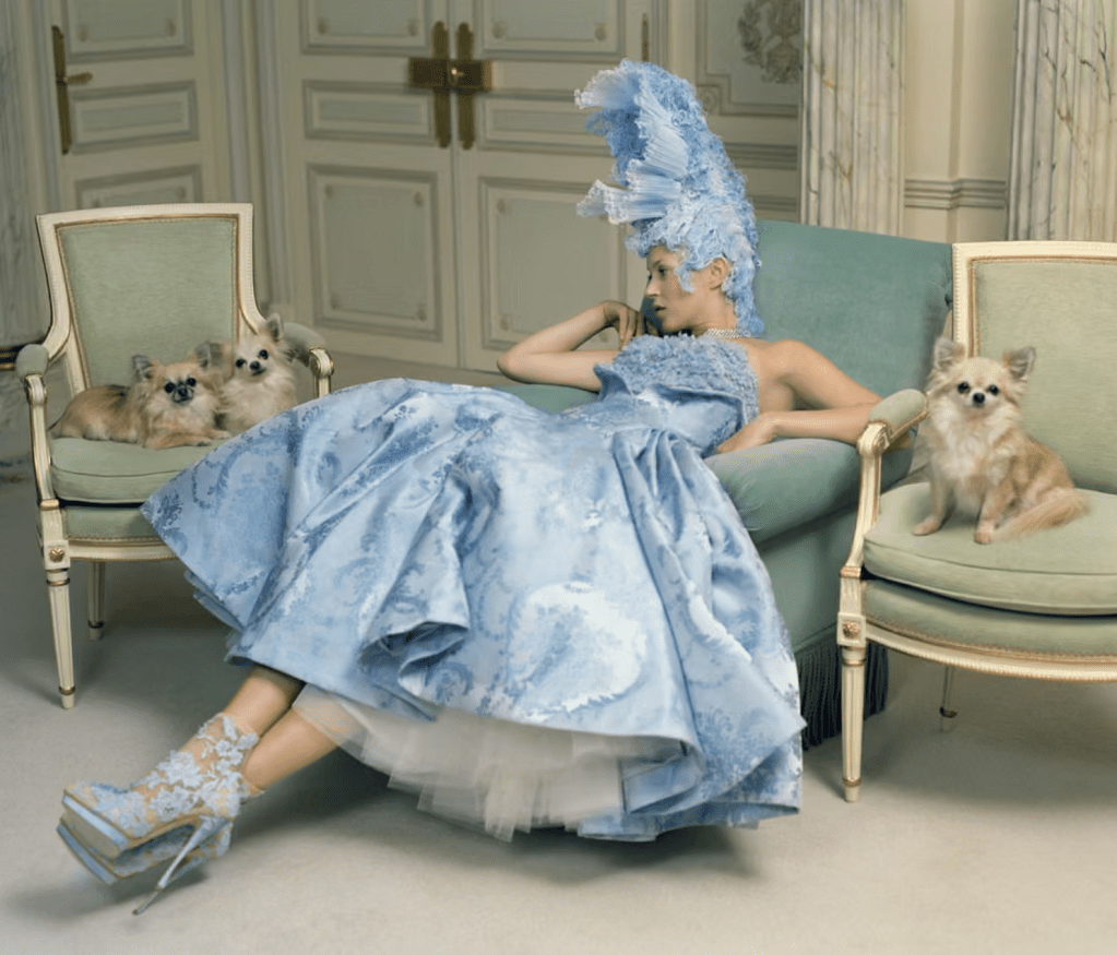 Yet aspects of her image seem completely stripped of their political connotations. She remains considered as a strange sort of teen-dream it-girl—commercial, sassy, iconoclastic, controversial, but above all, exciting. Madonna dressed as her to perform the hit song ‘Vogue’ at the 1990 VMAs. Feminist auteur Sofia Coppola chose her as the chic emblem of misunderstood girlhood in her stylish, punk-soundtracked 2006 Marie Antoinette. Kate Moss posed as her in a 2012 photoshoot for American Vogue, dripping in turquoise regalia by Alexander McQueen and with a look of glacial imperviousness to match. She turns away from the viewer, instead gazing adoringly at the finery she is surrounded by at the Imperial Suite of the Ritz in Paris, with its pastel-hued Louis XVI-style interiors.