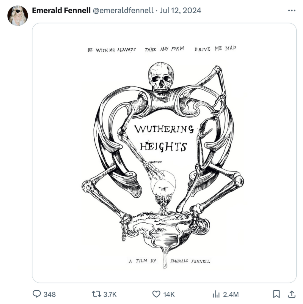 Sex sells, and the weirder the better. Emerald Fennell realised this in Saltburn (2023), and the success of those tantalising, enclosed, rage-baiting scenes in her second film comes to bear on the marketing – if not the substance – of her adaptation of “Wuthering Heights” (2026). For over a year, audiences have been promised a shocking and ‘aggressively provocative’ version of Emily Brontë’s classic and beloved novel. Back in August, the Guardian wrote about a test screening of Fennell’s then unfinished film that features ‘horse-rein sex, suggestive egg yolks and necrophile nuns’. While the horse-reins and egg yolks have stayed, Fennell has dispensed with the ‘nun fondling the corpse’s visible erection’ at the public hanging that opens the film (the erection, however, stays). This film has been long in the making and it has maintained an animated discourse throughout, ever since Fennell published that teaser image on X: a beautiful and strange gothic line drawing of what looks like skeletons engaging in oral sex.