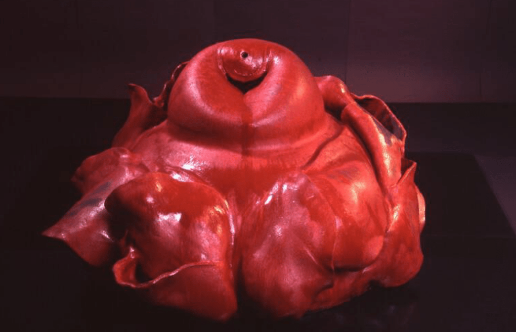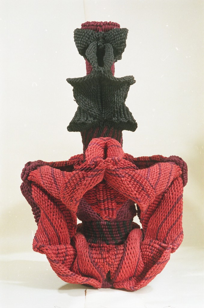 Cluster (both 1996) fuse botanical and anatomical life. Both brim with a primordial sexual energy. Earthbloom is the female anatomy in pulpy, unnerving red, while Burgeoning Cluster’s tendrils and offshoots make the clay appear as if it is mutuating and reproducing in real time. Mukherjee’s experiments with ceramic came later in her career than her more famous hemp works, beginning in 1995, but in moving to a new medium she lost none of her power.
