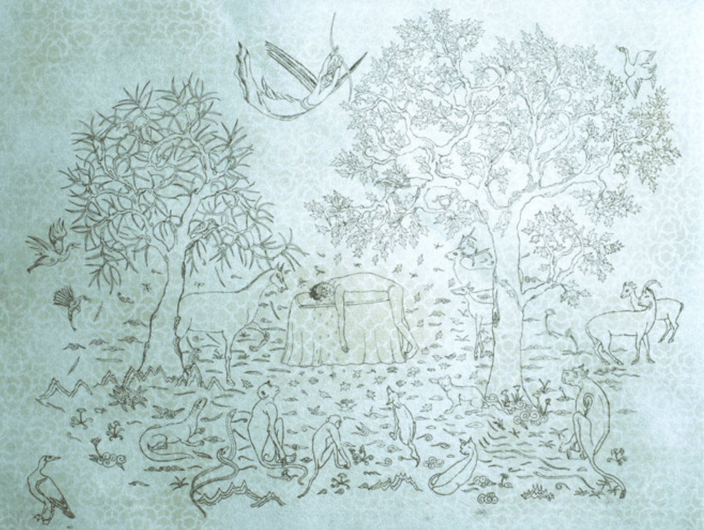 Grave (2006) is a delicate lithograph depicting the final scene from the 7th-century Arabic