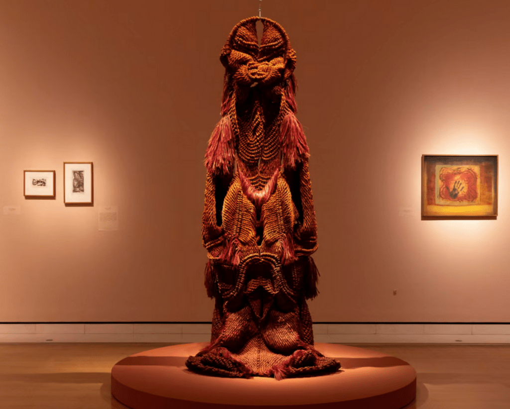 Upon entering the Sackler Wing of Galleries at the Royal Academy of Arts, London, one is apprehended by an intimidating figure standing sentry to the next rooms of the exhibition. This is Mrinalini Mukherjee’s Pakshi: part-soldier, part-phallus, entirely commanding. Pakshi translated from Sanskrit is ‘bird’, but the Royal Academy have here presented Mukherjee’s hemp figure without comment or explanation, allowing the viewer to assess this imposing monolith on their own terms.