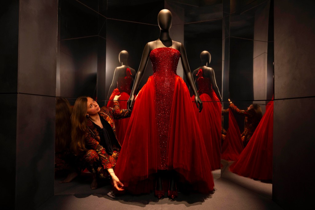 While Roseberry’s work is interspersed throughout the exhibition, it is primarily concentrated within two gallery spaces. Highlights include a jacket from Autumn/Winter 2021, worn by Lady Gaga for Vogue Italia, which brings together a collage of artistic styles through fractured anatomical elements and Surrealist and Cubist motifs; a sculptural scalloped corset dress from Spring/Summer 2025; and a red sequinned ball gown, worn by Ariana Grande to the 2025 Oscars, which nods to the iconic Shoe Hat. However, there is comparatively little material within the exhibition itself on Roseberry, his influences, or his relationship to art, although the accompanying catalogue provides some additional context.
