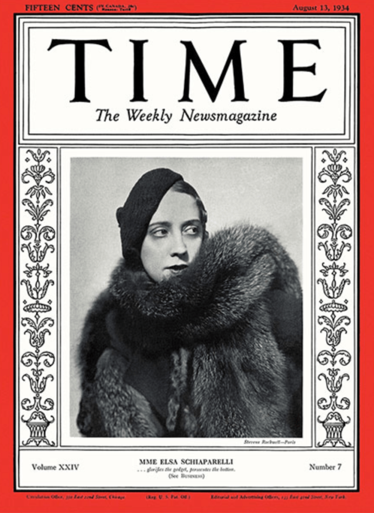 While not the first woman to appear on the cover of Time, Schiaparelli’s presence marks a significant cultural moment. It reflects fashion’s growing alignment with broader cultural and intellectual currents during a period in Europe marked by political instability and the lingering effects of the Great Depression. Schiaparelli, a leading figure of the avant-garde, stands firmly at its centre. In the accompanying article, she is described as “madder and more original than most of her contemporaries,” the designer to whom the word “genius” was most often applied.