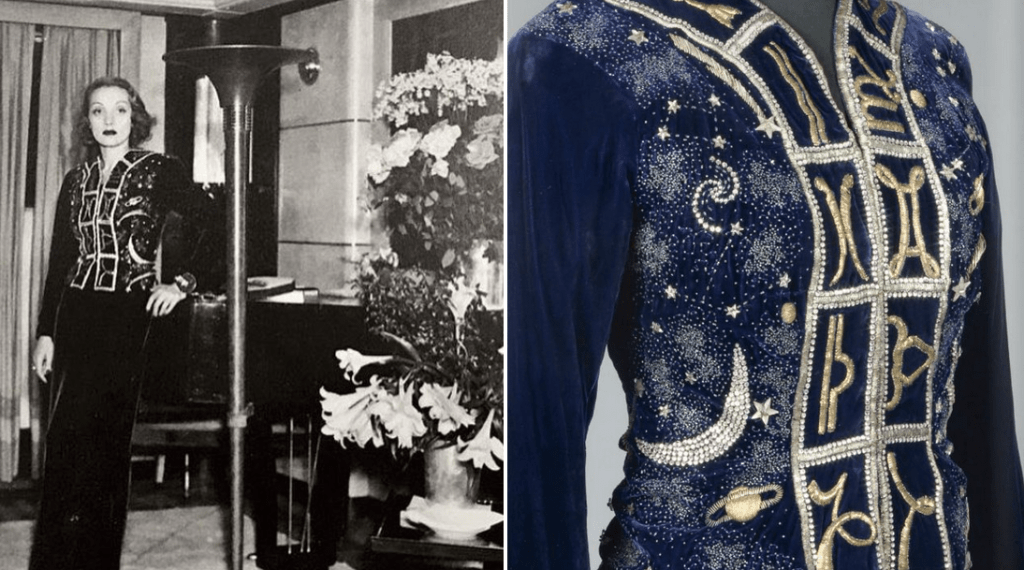 The titles of some of her most notable collections—Pagan (Autumn 1938), Zodiac (Winter 1938–39), and Circus (Summer 1938)—reflect this enduring sensibility, expressed in the exhibition through works such as the midnight blue Zodiac Jacket, with its constellations of silver and gold planets, famously worn by Marlene Dietrich in 1938 and a vivid pink silk twill jacket adorned with acrobats and prancing horses. Together, these works signal a sustained engagement with the poetics of the unseen.